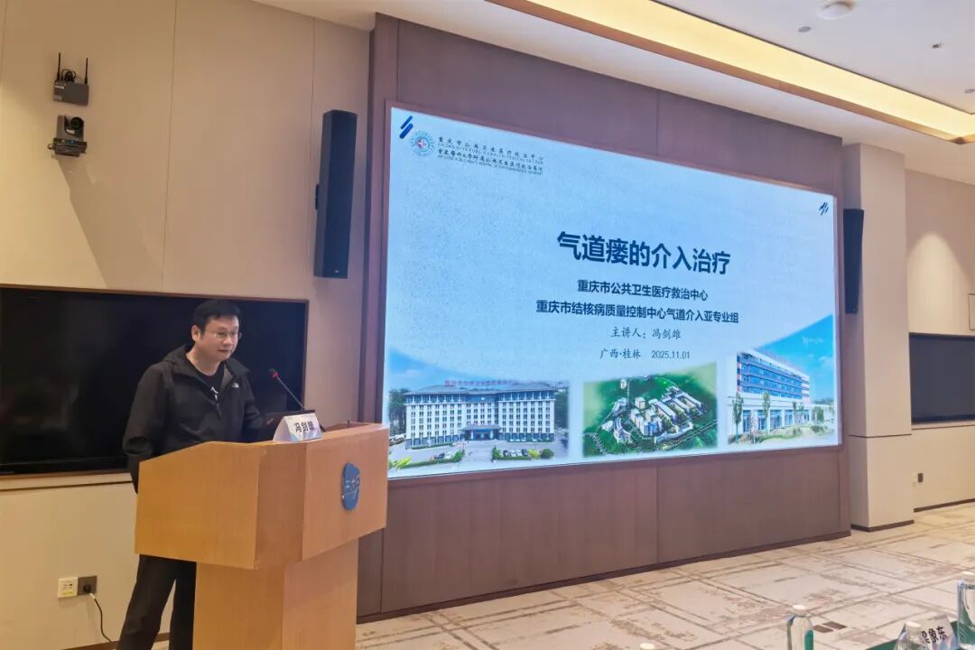▲重庆市公共卫生医疗救治中心/微创介入中心主任冯剑雄作《气道瘘的介入治疗》专题报告。