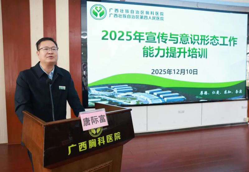 为深入贯彻落实新时代意识形态工作要求,切实提升全院宣传队伍政治素养与业务能力,12月10日,广西胸科医院开展2025年宣传与意识形态工作能力提升培训。医院各党支部书记、宣传委员,各科室、病区宣传通讯员以及相关职能科室负责人参加培训。