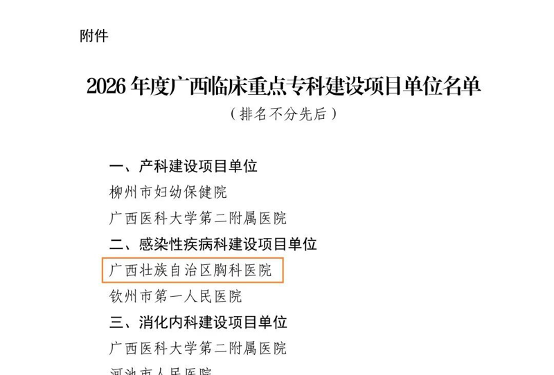 12月8日,自治区卫生健康委公布了2026年度广西临床重点专科建设项目单位,广西胸科医院感染性疾病科成功入选。这是医院感染性疾病科继获批柳州市临床重点专科、国家中西医协同“旗舰”科室建设项目后,再获自治区级权威认可,标志着医院感染性疾病诊疗水平与专科建设能力再上新台阶。