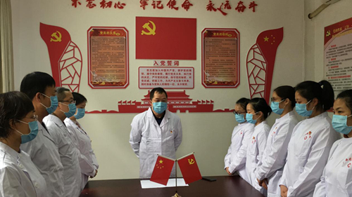 第一批进入隔离病区的15名医务人员中,有9名中共党员,均来自不同的党支部。自启动隔离病房以来,有6名同志受到了党员榜样的感召,积极向组织递交了入党申请书。由于第一梯队的医务人员目前仍处于从隔离病房“出舱”后的隔离观察时期,这场本应隆重举行的仪式,就由内科一党支部书记黄大勇带领着来自不同党支部的党员见证了这个光荣的时刻,使得这一场入党宣誓显得格外特别。
