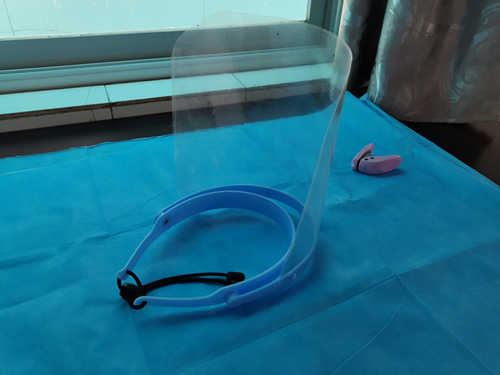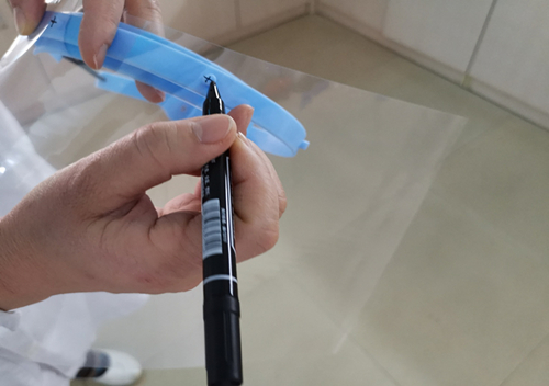 具体制作流程如下:一次性防护面屏使用后将面屏弃去,留下头套消毒(可反复使用),备用。