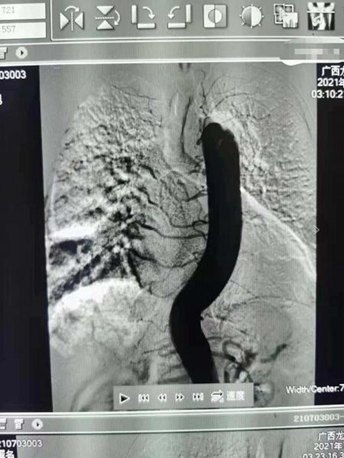 在医护人员的护送下,介入治疗室立即开通绿色通道为患者实行介入手术,经过四个多小时的紧急动脉造影栓塞介入治疗,患者咯血停止,生命转危为安。