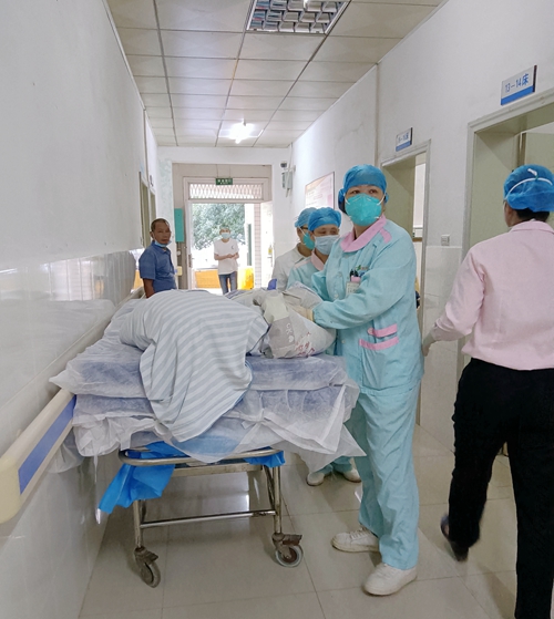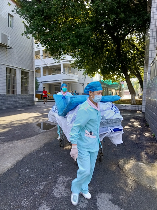 护理部组织了11名护理志愿者参与了回迁工作,他们积极主动到最需要的地方,戴着憋气的N95口罩、迎着酷暑骄阳,与结核科二、四病区护理人员一道转运患者、物资、参与配制输液药物等工作。