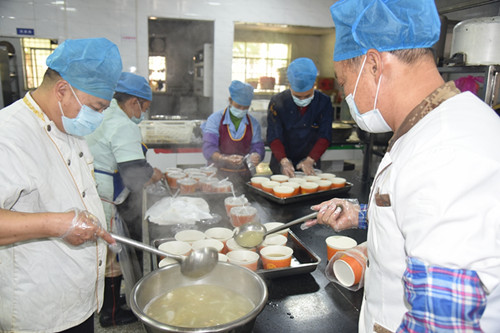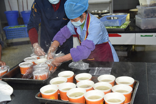 营养食堂根据三名队员的要求将羊肉精心烹煮。中午时分,一锅香气四溢、营养温补的羊肉汤就做好了,食堂工作人员将这大锅羊肉汤分出约60份由抗疫队员蓝珂、梁兴以及各住院科室护长领回分发给住院患者。