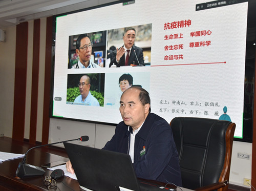 韦永忠同志从中国实践的精神写照、中国力量的精神升华、中国精神的生动诠释三个方面解读了在抗击疫情中淬炼的中国精神。同时,他还对比了中国与其他西方国家的抗疫措施、抗疫成效,进一步凸显了中国制度的优越性,展现了中国精神具有的强大凝聚力。在“大力弘扬和践行医务人员的崇高职业精神”部分,韦永忠同志以广大医务人员在这场战“疫”中义无反顾、日夜奋战,用血肉之躯筑起阻击病毒的钢铁长城,挽救了一个又一个垂危生命的生动事例深刻阐述了医务工作者“敬佑生命、救死扶伤、甘于奉献、大爱无疆”的崇高职业精神。
