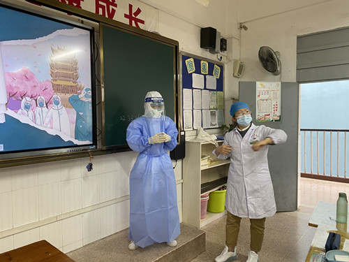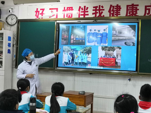 到了尾声,班主任提问:同学们,你们在今天的讲座里都学到了什么?同学们七嘴八舌地回答:“学到防疫知识”“体会到医生的辛苦”……一名试穿了防护装备的同学说:“呼吸好困难、走路不方便……”