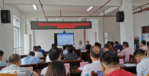 陈登翠组长在靖西市卫生健康局举办全系统的应对秋冬季新冠肺炎疫情防控暨医疗救治培训会上通报反馈了督查靖西市乡镇卫生院疫情防控及医疗救治工作等情况,并提出改进建议,同时结合存在问题开展感控基础知识培训。