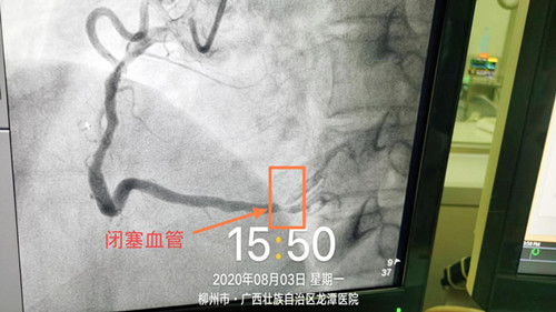 在救护车上张医生向患者吴先生简单扼要说明了诊断情况和接下来将采取的诊疗措施,吴先生对急性心肌梗死急救知识和龙潭医院的治疗水平非常了解,便同意了在我院行急诊介入治疗的建议。我院胸痛中心立即为患者开通绿色通道,一键启动导管室,救护车不需经停急诊科、心内科(业内称“绕行”)直达导管室进行急诊介入治疗。心血管内科唐国林主任、放射科文新年主任和介入室工作人员早已严阵以待做好准备,患者一进入介入室立即进行左右冠状动脉造影检查,结果显示,患者左冠状动脉前降支中段和右冠状动脉远段均明显狭窄,根据病变情况必须马上进行介入手术为患者打通闭塞的血管,争分夺秒挽救患者的心肌和生命。介入治疗专家与患者家属进行了快速有效的沟通,家属同意专家们的意见,随后专家组顺利给患者施行了冠状动脉内血栓抽吸术+支架植入术。