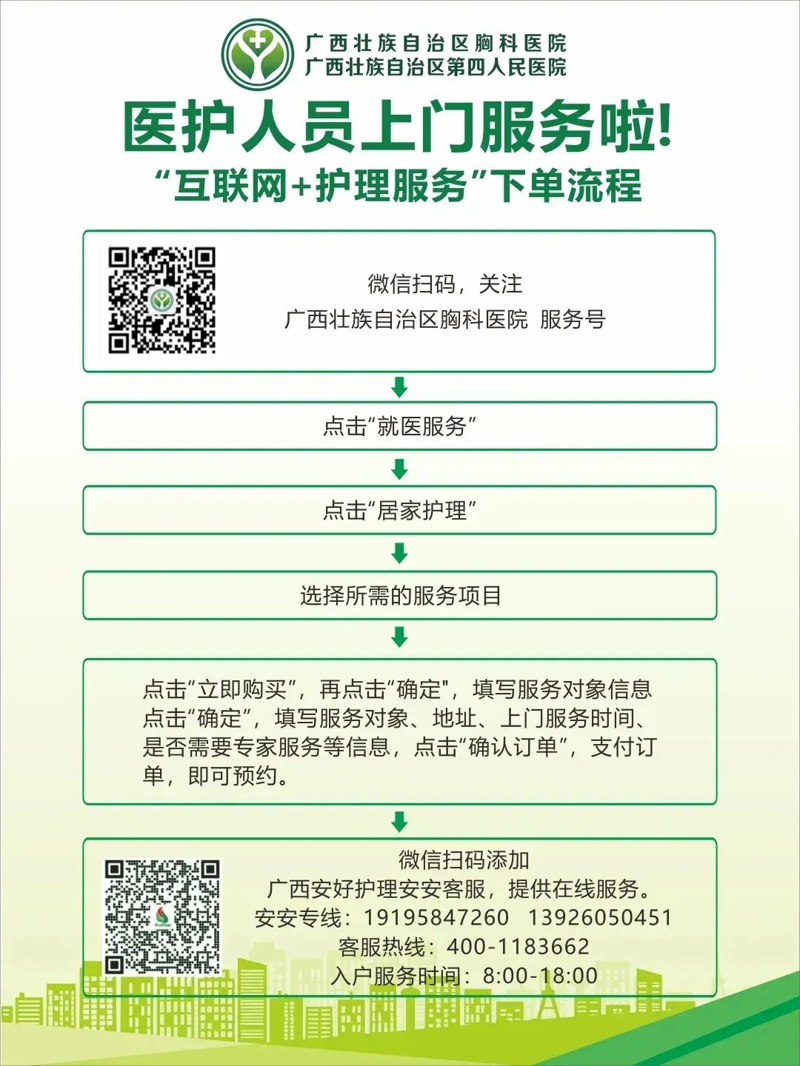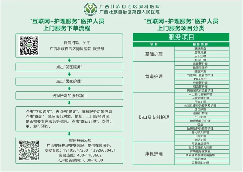 广西胸科医院推出的“互联网+护理服务”致力于为高龄或失能老人、出院患者、康复期患者和终末期患者等行动不便的人群提供专业上门护理服务,服务内容包括基础护理、管道护理、专科护理、康复护理、伤口护理等,让患者足不出户就能享受到与院内同质化的专业护理服务,持续提升患者的就医体验,增强患者的健康获得感。