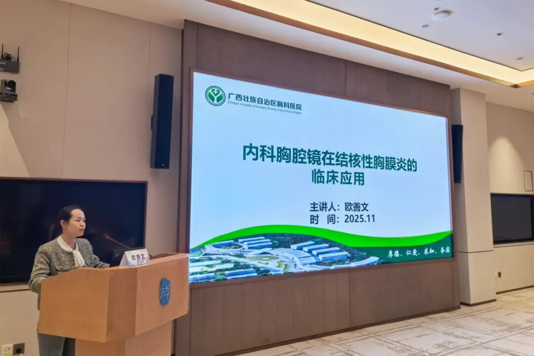 ▲广西壮族自治区胸科医院内窥镜室副主任欧善文作《内科胸腔镜在结核性胸膜炎的临床应用》专题报告。