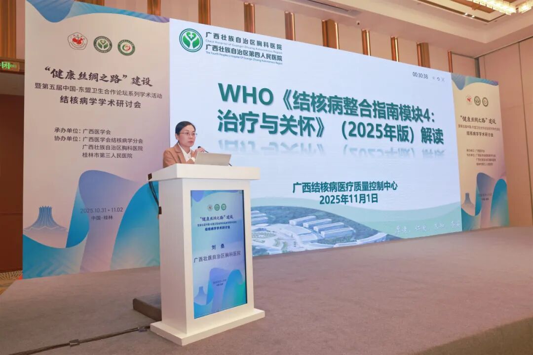▲广西壮族自治区胸科医院副院长刘桑作《WHO〈结核病整合指南模块4:治疗与关怀〉(2025年版)解读》专题报告。