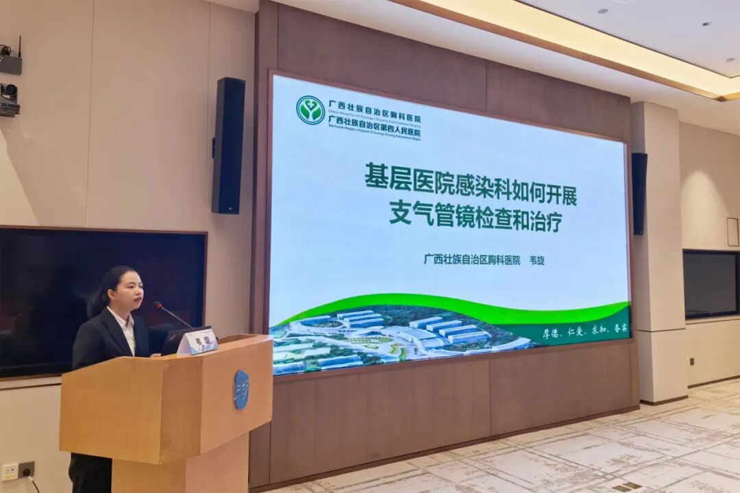 ▲广西壮族自治区胸科医院呼吸内科二病区韦旋博士作《基层医院感染科如何开展支气管镜检查和治疗》专题报告。