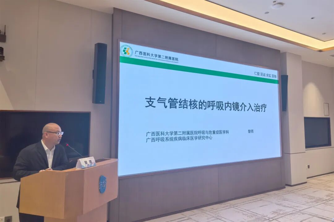 ▲广西医科大学第二附属医院呼吸与危重症医学科副主任黎雨作《支气管结核的呼吸内镜介入治疗》专题报告。