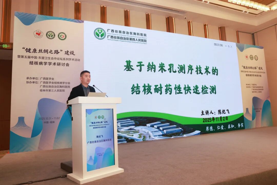 ▲广西壮族自治区胸科医院科教科科长陈纪飞博士作《基于纳米孔测序技术的结核耐药性快速检测》专题报告。