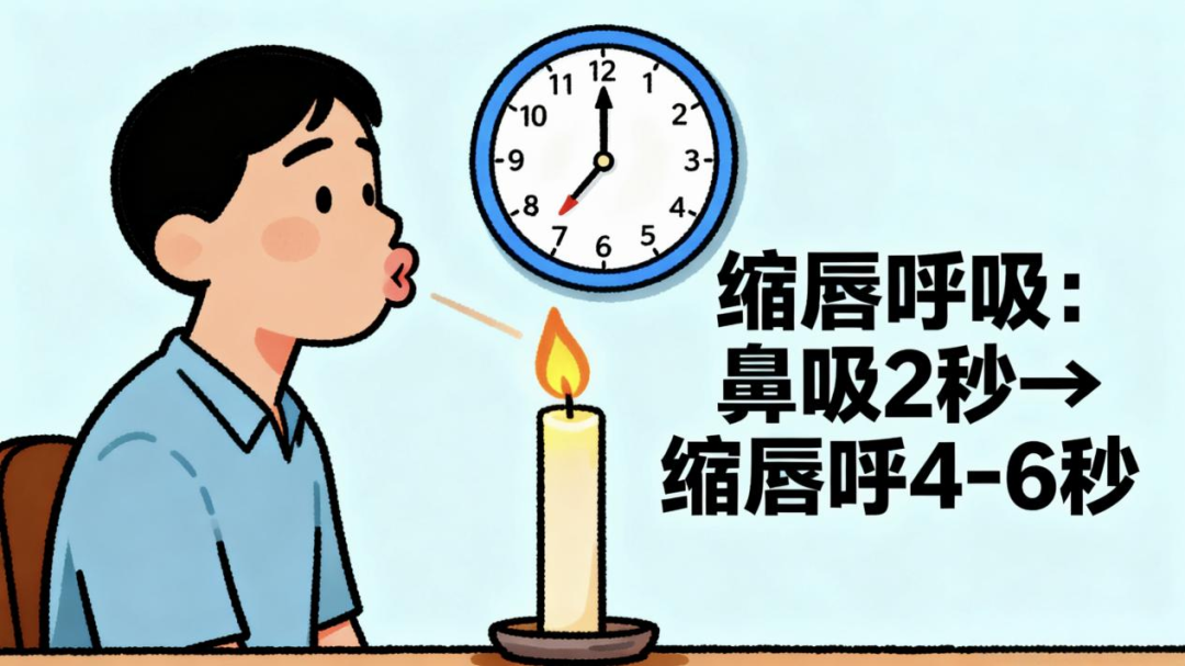 ②然后嘴唇缩成“吹蜡烛”的形状,慢慢向外呼气,呼气时间尽量比吸气时间长(比如吸气2秒,呼气4秒)。