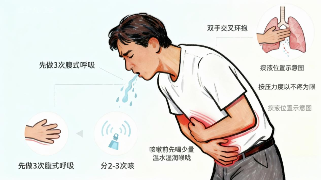 ②身体稍微前倾,双手抱住腹部(或按住伤口两侧减轻疼痛),用力收缩腹部,张嘴快速咳出痰液(可以分2-3次咳,更省力)。