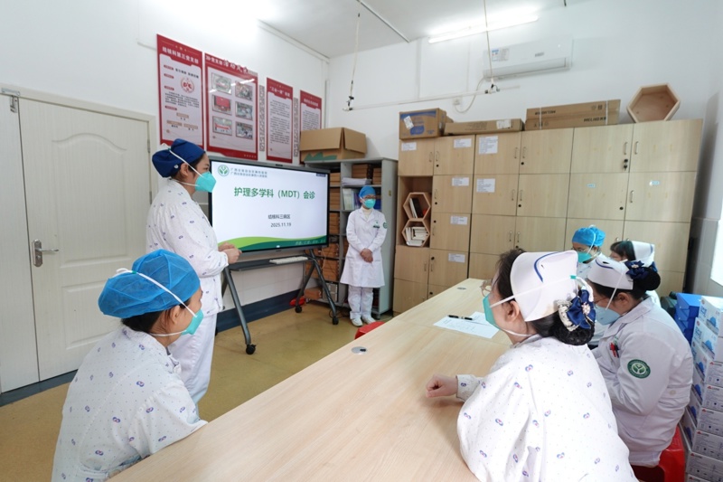 面对复杂的病情,科室医疗团队迎难而上,为梁大爷进行了系统的“老年健康综合评估”,掌握了其营养、肌力、心理等整体状况,并通过多学科会诊(MDT),联合心血管内科、营养科等专家,制定了一套集治疗、康复、营养支持于一体的个性化方案。同时,通过护理查房等形式,不断动态调整、优化治疗方案。