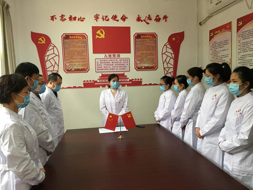 第一批进入隔离病区的15名医务人员中,有9名中共党员,均来自不同的党支部。自启动隔离病房以来,有6名同志受到了党员榜样的感召,积极向组织递交了入党申请书。由于第一梯队的医务人员目前仍处于从隔离病房“出舱”后的隔离观察时期,这场本应隆重举行的仪式,就由内科一党支部书记黄大勇带领着来自不同党支部的党员见证了这个光荣的时刻,使得这一场入党宣誓显得格外特别。