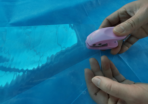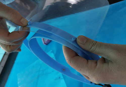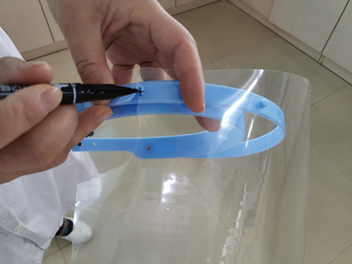 具体制作流程如下:一次性防护面屏使用后将面屏弃去,留下头套消毒(可反复使用),备用。