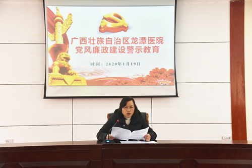 1月19日下午,广西龙潭医院召开警示教育大会。医院领导班子成员和中层干部参加会议。会议由纪委书记江灼巧主持。 会上,江灼巧通报了医院两起违纪案例的查处及相关人员的处理情况,并对党员干部提出了具体要求:一要切实增强遵纪守法意识,自觉抵御各种外部干扰和利益诱惑,守住职业道德底线,远离违法违规红线,切勿触碰“九不准”高压线;二要认清形势,提高政治站位,不要有侥幸心理;三要认真落实好“一岗双责”;四要加强廉洁风险防控管理。 江灼巧还通报了自治区纪委、柳州市纪委监委曝光的近期查处的几起违反中央八项规定精神问题典型案例,传递了当前防止四风问题反弹、坚决遏制年节腐败的强烈信号,同时重申了春节期间的纪律要求。全院党员干部和职工要按照驻委纪检监察组要求,严格落实自治区纪委通知精神,巩固拓展落实中央八项规定及其实施细则精神成果,党支部书记、全体中层干部要带头并教育本支部、本科室党员和干部职工做到“七个严禁”,春节期间医院纪检监察部门还将开展相关监督检查。