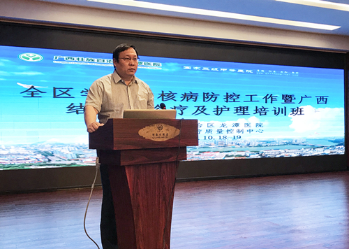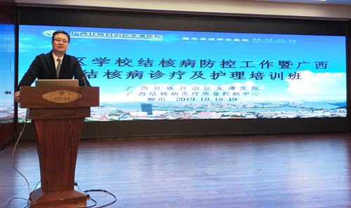 2019年10月18日,由广西壮族自治区龙潭医院、广西结核病医疗质量控制中心主办的全区学校结核病防控工作暨广西结核病诊疗及护理培训班在柳州市盛大召开。来自广西各市、县(市、区)结核病定点医疗机构、疾控中心近500名从事学校防控、结核病相关诊疗及护理管理工作的医生、护士及疾控工作者参加了会议。自治区卫生健康委员会疾病预防控制处处长郑承杰、自治区龙潭医院副院长唐际富出席会议并发表讲话。