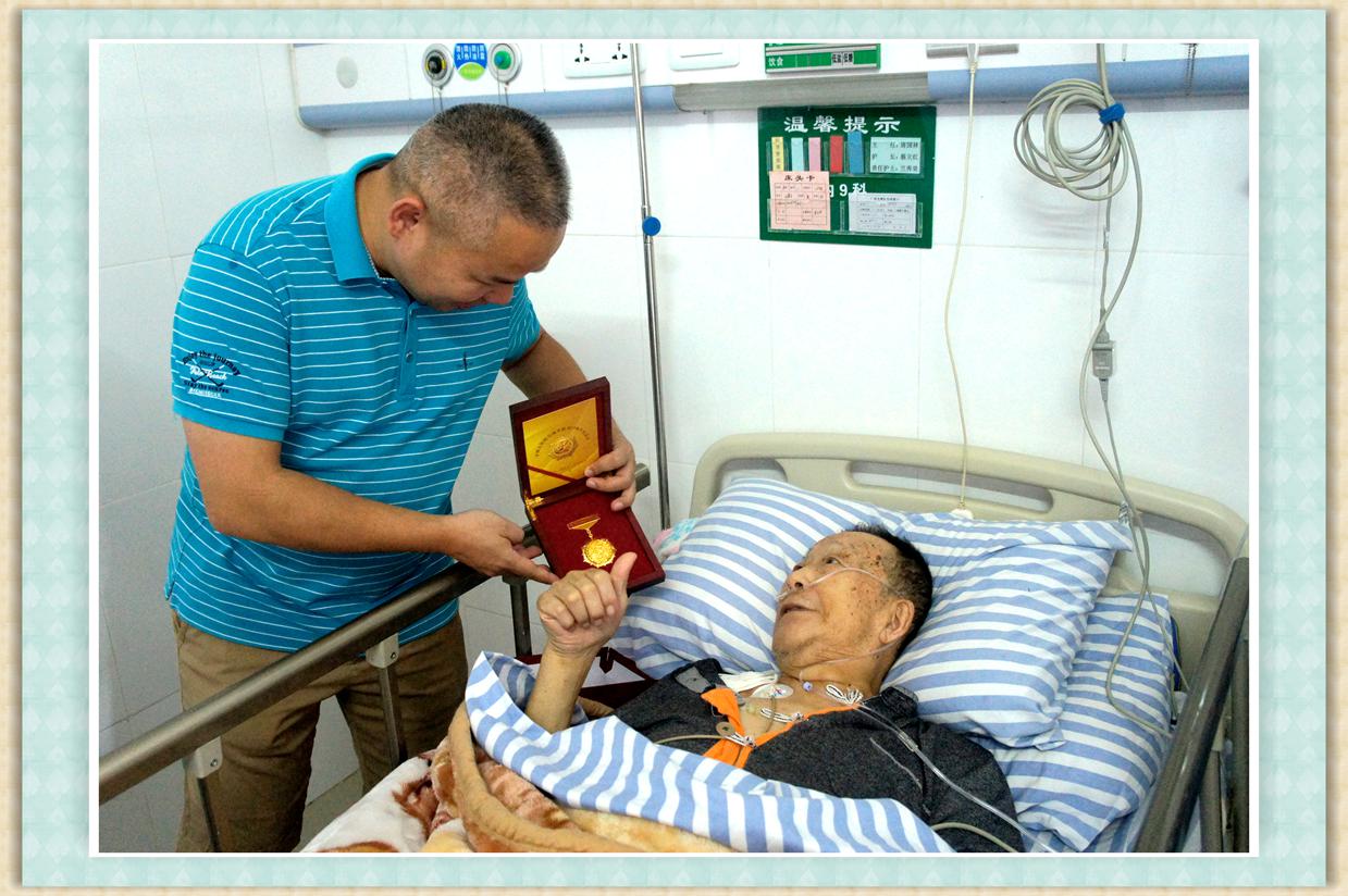 医院办公室主任梁汉武向张盛吉老人解释纪念章的来历