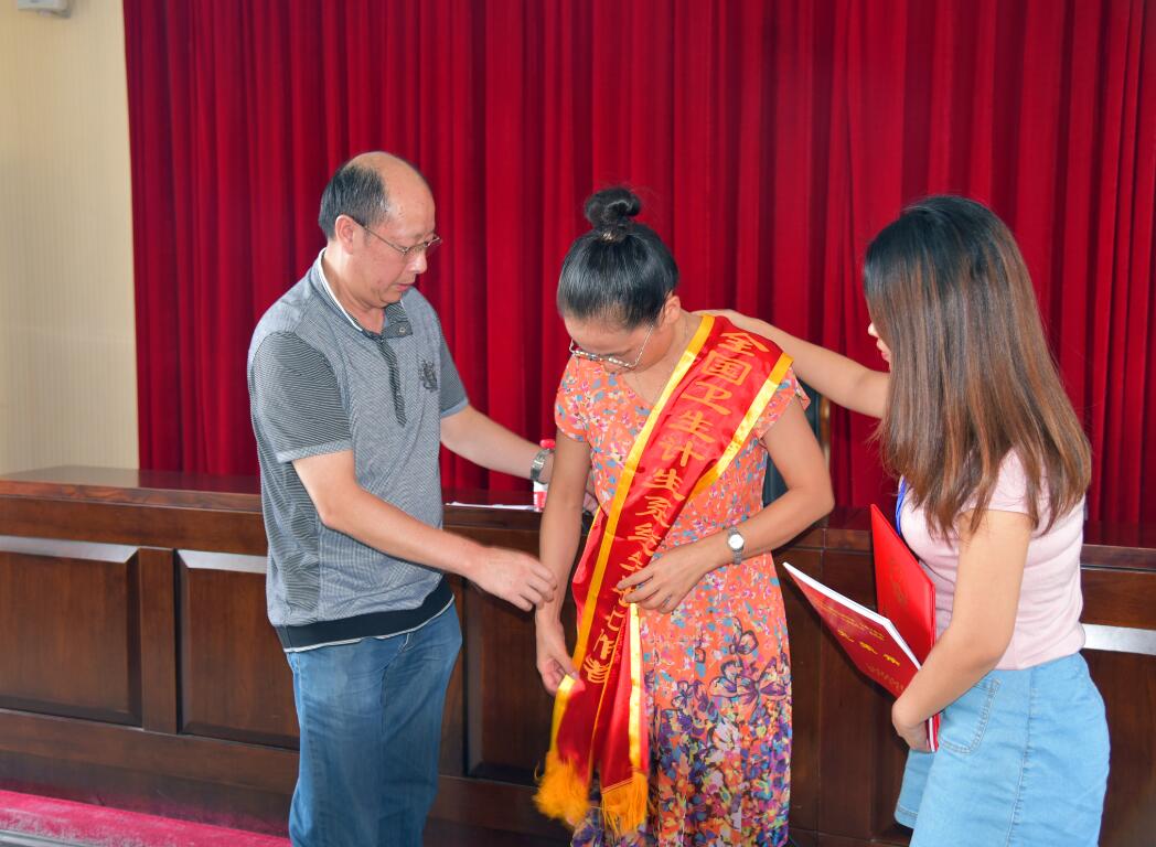 党委书记邓晓军为蓝珂同志佩戴“全国卫生计生系统先进工作者”授带
